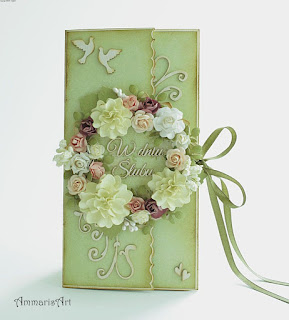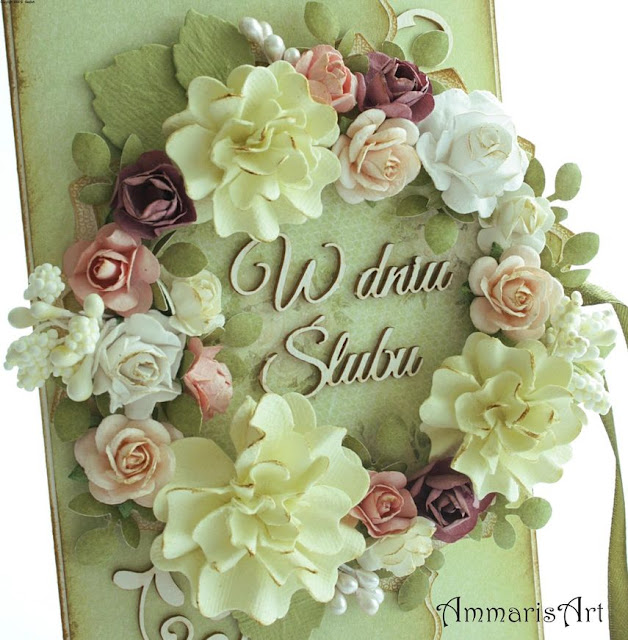 This evening I'd like to show you a green wedding ribbon tied card. The main decoration is the colourful flower wreath. I've aged the card with the ink and added some chipboards. One of them is the sentence: "Wedding Day".