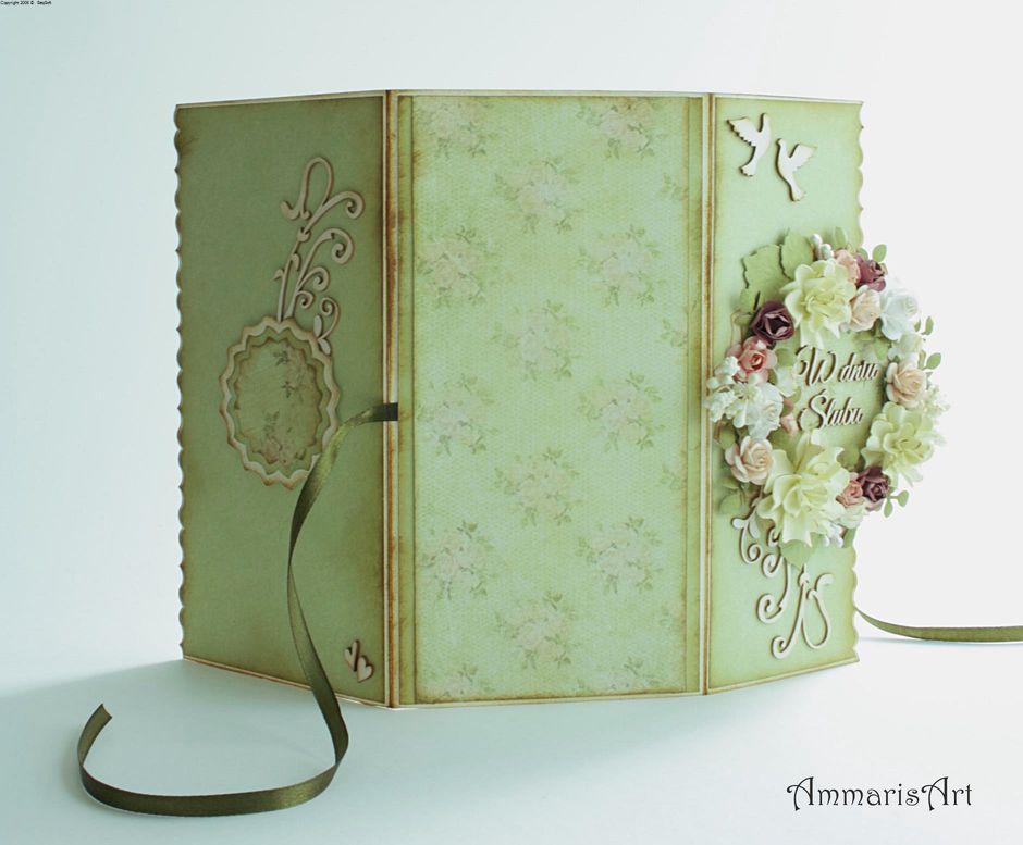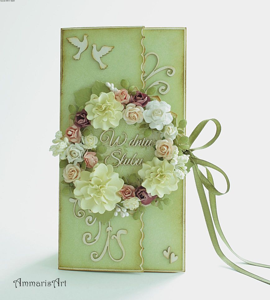 Dzisiejszego wieczoru chciałam Wam pokazać zieloną kartkę ślubną. Kartkę zawiązuje się wstążką a jej główną dekorację stanowi kwiecisty wianek. Pracę dosyć intensywnie postarzyłam tuszem i dodatkowo ozdobiłam tekturkami.
