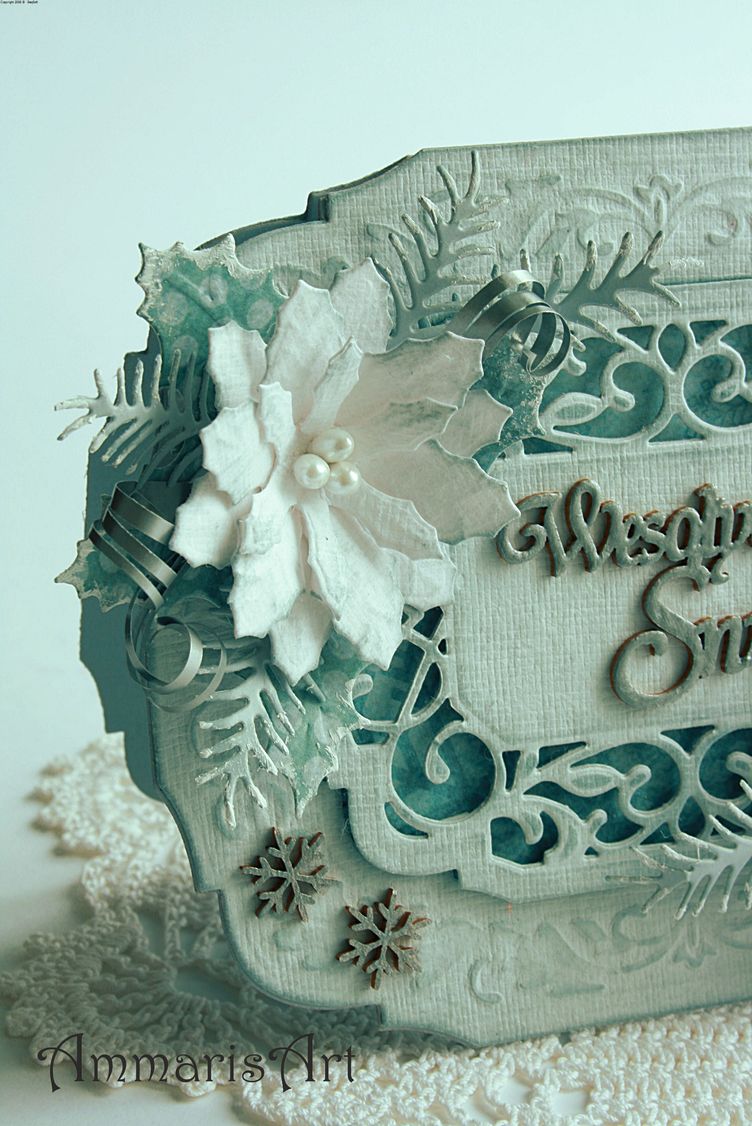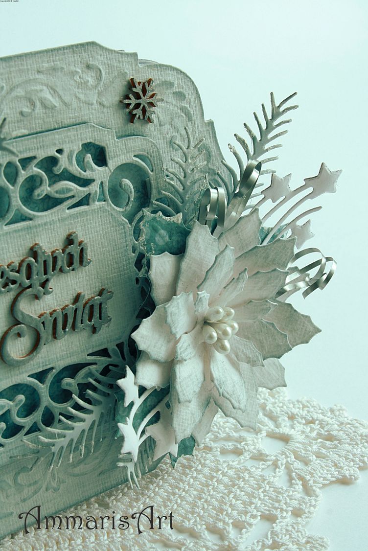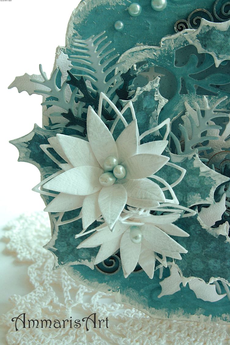 The second card is darker and it's inked, painted gesso and decorated with pearls, chipboards, a metal angel and handmade poinsettia flowers. Chipboards are painted silver metallic paint.